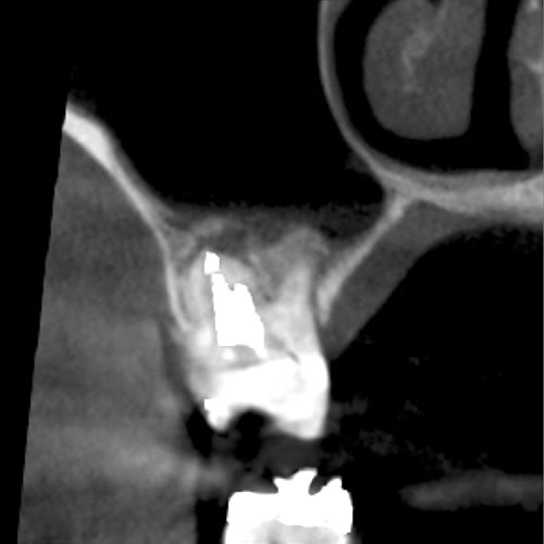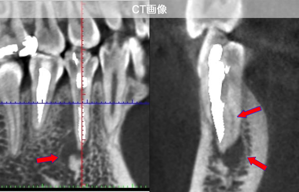 CT画像を見ると根管が2本あることが分かりました。(レントゲンだけでは分かりませんでした。)