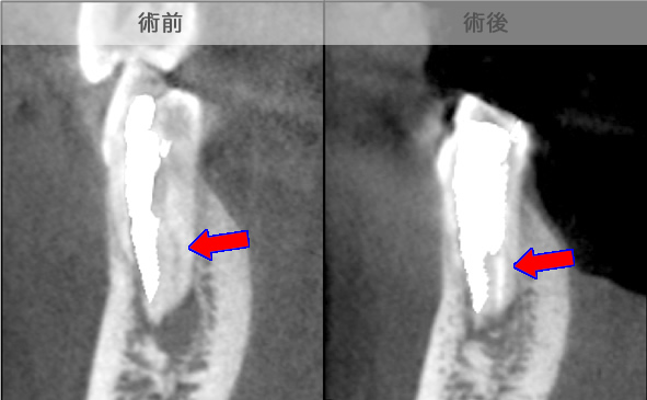 | 治療に伴うリスク | 根管内からの治療で根尖病巣が治らない場合は、外科的に根尖病巣を除去する必要があります。 再根管治療を繰り返す場合、歯根の厚みが薄くなり、歯根破折のリスクが高まります。 |
