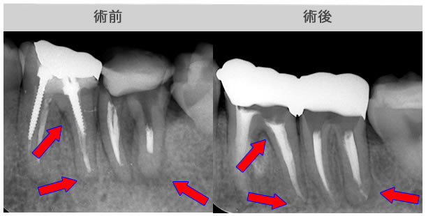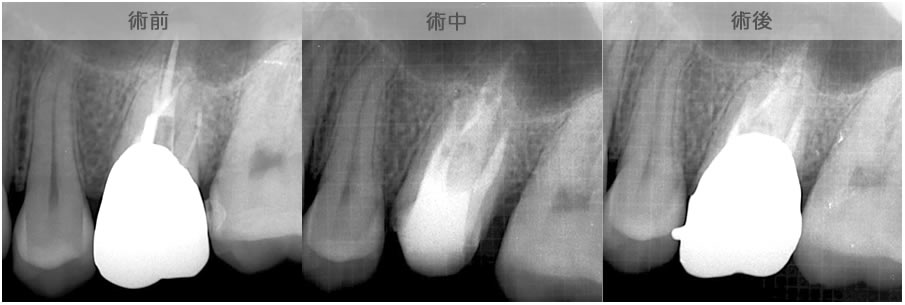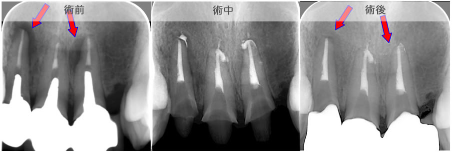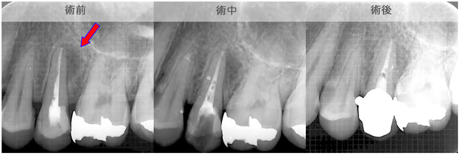 | 治療説明 | 上顎前歯部の根尖部からの排膿があります。歯冠補綴物とメタルコアを除去し、根管治療を行いました。根尖部から根充剤が漏れてはみ出していましたが、X線透過像は消失しました。 |