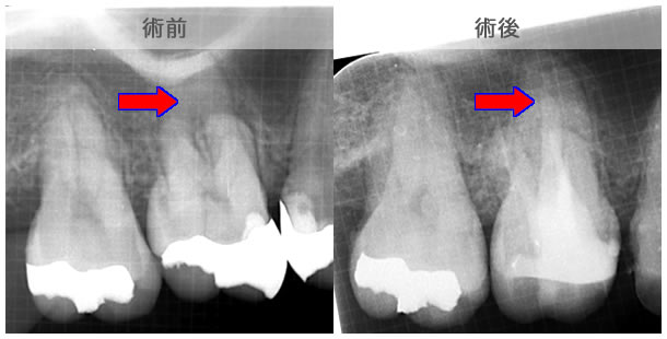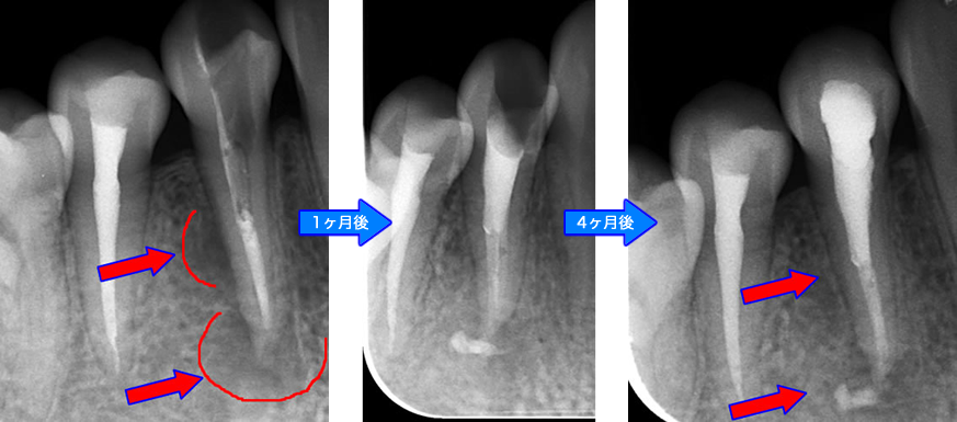 | 治療説明 | 上顎前歯部の根尖部からの排膿があります。歯冠補綴物とメタルコアを除去し、根管治療を行いました。根尖部から根充剤が漏れてはみ出していましたが、X線透過像は消失しました。 |