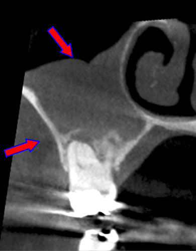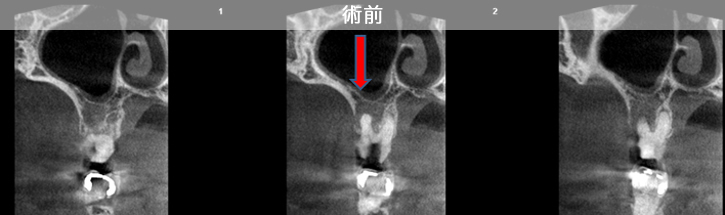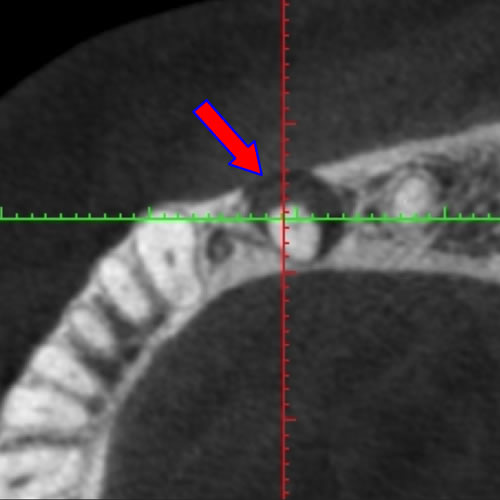 CT画像を見ると根管が2本あることが分かりました。(レントゲンだけでは分かりませんでした。)