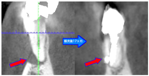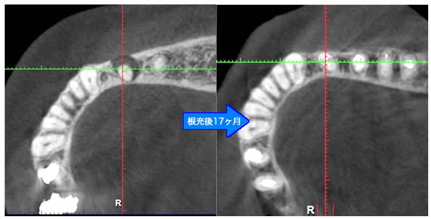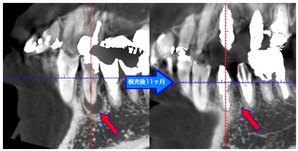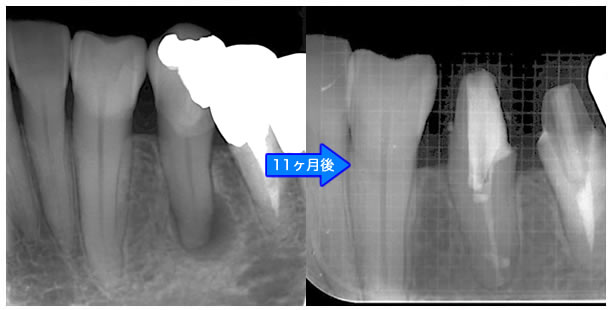 MTA根充後11ヶ月で透過像が消失し、根尖部が正常化しました。