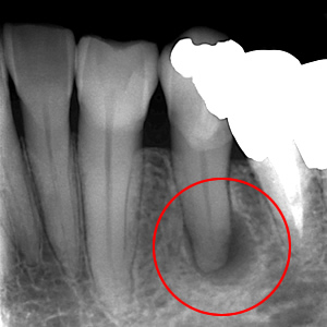 原因は赤の矢印が指す、根の周りの病巣でした。